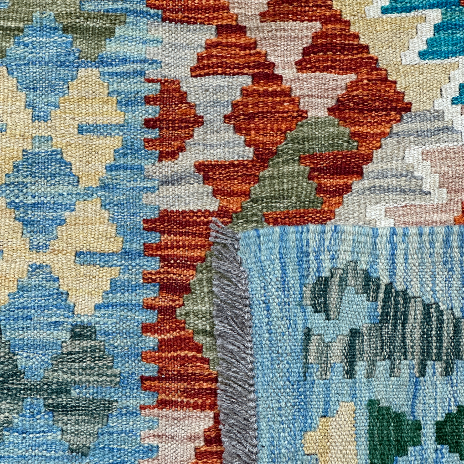The Maimana Kilim is a handmade Afghan kilim rug, woven using traditional techniques and natural fibers. Featuring bold geometric patterns and authentic craftsmanship, each piece is unique and full of character.